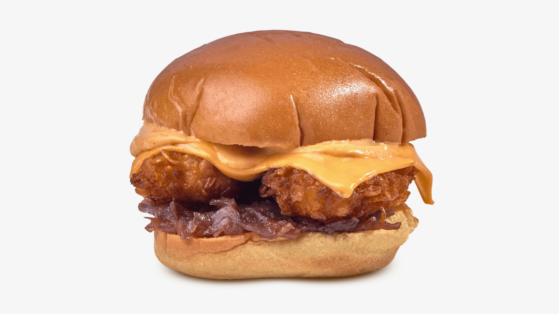Super knuspriges Hänhchen-Patty unter melty Cheddar, karamellisierte Zwiebeln und unsere Borings Best House Sauce - crazy Crunch!